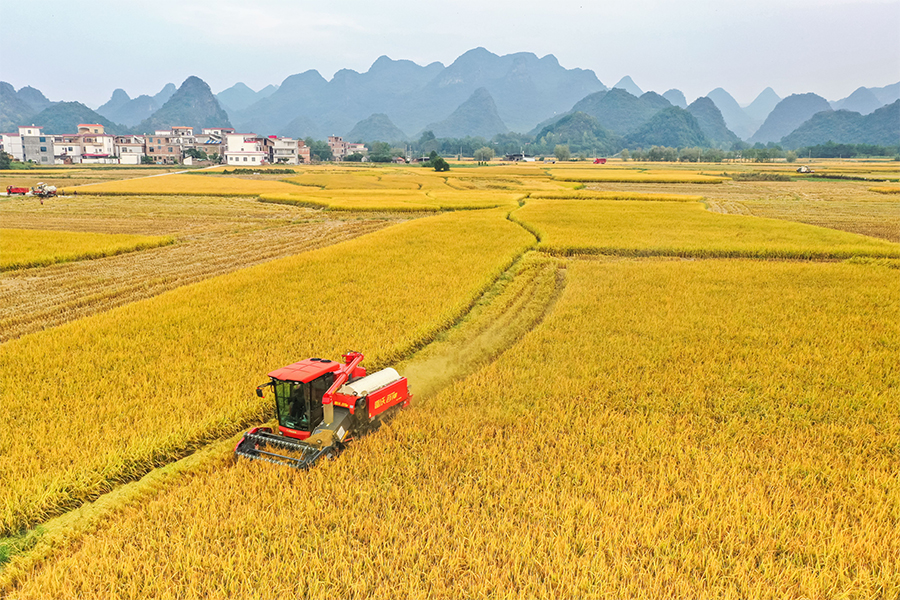 10月26日,寧遠縣灣井鎮下灌村,收割機在稻田里來回穿梭作業。金秋時節,該縣19.3萬畝晚稻進入集中收獲期,當地通過“科技+服務”模式,助力秋糧豐產豐收。 彭華 攝(湖南圖片庫)