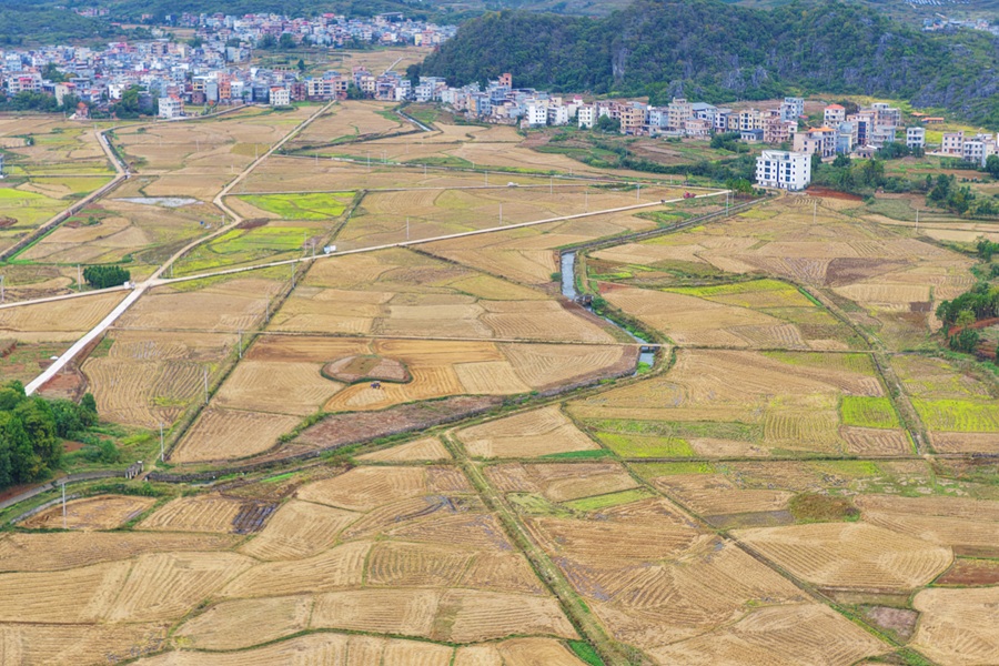 11月11日,嘉禾縣廣發鎮白覺村,秋收過后,收割機在田間留下蜿蜒轍印,宛如大地“指紋”,與民居、公路、山巒相映成趣,構成了一幅田園立體畫卷。黃春濤 攝