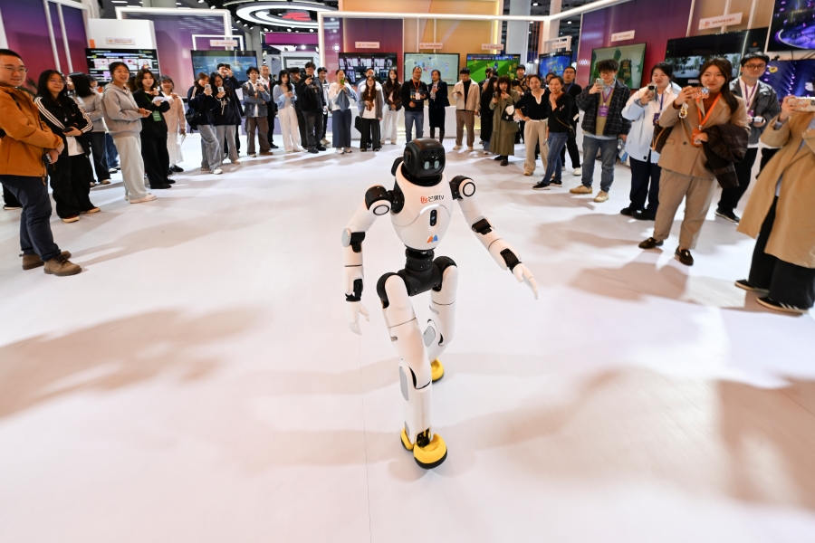 11月12日,湖南國際會展中心(芒果館),觀眾與機器人互動。當天,2025中國新媒體技術展在長沙啟幕。 本版照片均為湖南日報全媒體記者 辜鵬博 攝
