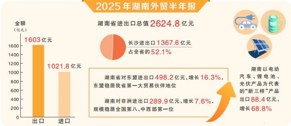 7月22日,長沙海關舉行2025年上半年湖南省進出口情況新聞發布會。今年上半年,湖南省進出口總值2624.8億元,其中出口1603億元,進口1021.8億元;長沙進出口1367.6億元,占全省的52.1%。6月份單月,全省進出口511.8億元,同比(下同)增長14.5%,高于同期全國增幅9.3個百分點,其中出口318.6億元、增長14.3%,進口193.2億元、增長14.9%。