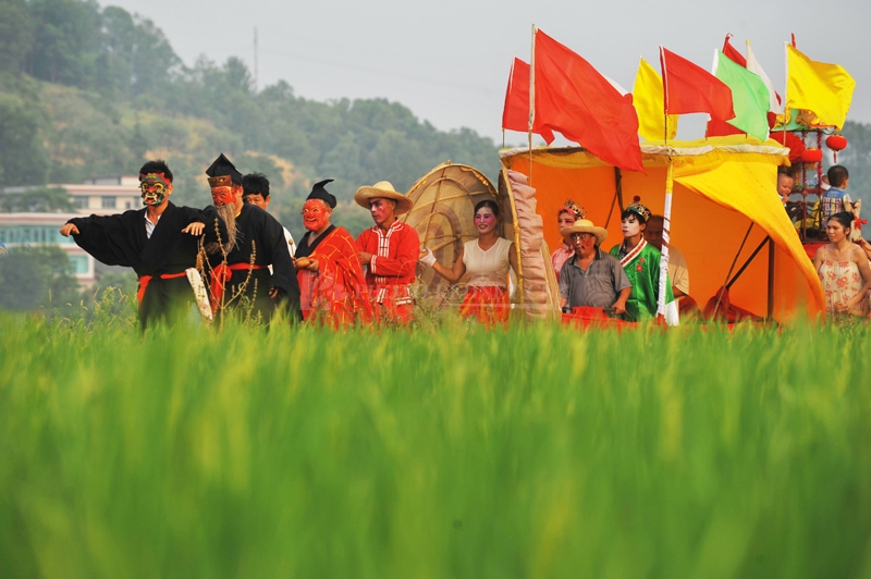 珠梅“抬故事”是出現(xiàn)在湘中地區(qū)的一項(xiàng)頗有影響的民間活動。地處湖南省漣源市龍?zhí)拎l(xiāng)。明崇禎年間,當(dāng)時(shí)道教已傳入安化(現(xiàn)漣源市)各地,珠梅“西元山觀”是最早建立的道教寺觀之一,在當(dāng)時(shí)戰(zhàn)亂、民不聊生的情況下,人們祈求祛病消災(zāi),以道教齋醮形式,許愿“抬故事”,以了人們的心愿,如此“抬故事”的活動就逐漸得到發(fā)展,延續(xù)幾十代而發(fā)展至今。改革開放以后,逐漸推陳出新,既保持了古俗風(fēng)貌,又創(chuàng)立了一些新的形式,從而逐步演變成了揚(yáng)善懲惡的一種群眾性自娛文化活動。它取材于神話傳說,歷史故事和現(xiàn)實(shí)生活,一臺故事一個(gè)人物,表達(dá)一個(gè)故事史實(shí),反映人們一種期望。“故事”形式多樣,既有原始型的,又有現(xiàn)代型的,如:“東吳成親”、“紅色娘子軍”、“農(nóng)家樂”等還有“揪千故事”,“盤故事”、“船故事”、“馬故事”、“夜故事”等。它以形象達(dá)意、流動表意,被人們稱為“流動舞臺”。其中高低樁的每臺故事一個(gè)座臺,一米見方,高約0.8米,紅布鋪蓋,支有包裝精致的鐵架,整高丈余。故事臺架的最上層稱之為“太子”,由一歲左右的幼兒扮演。中層稱之“臣子”,由10歲左右的兒童少年扮演,化戲劇人物妝,站立于座臺上。座臺的前后是四名抬杠的,兩邊跟隨兩名持長叉的武士。一臺故事,三層人物,年齡懸殊,形態(tài)各異,化妝不拘一格,濃淡相宜,相映成趣,各種不同形式的故事。