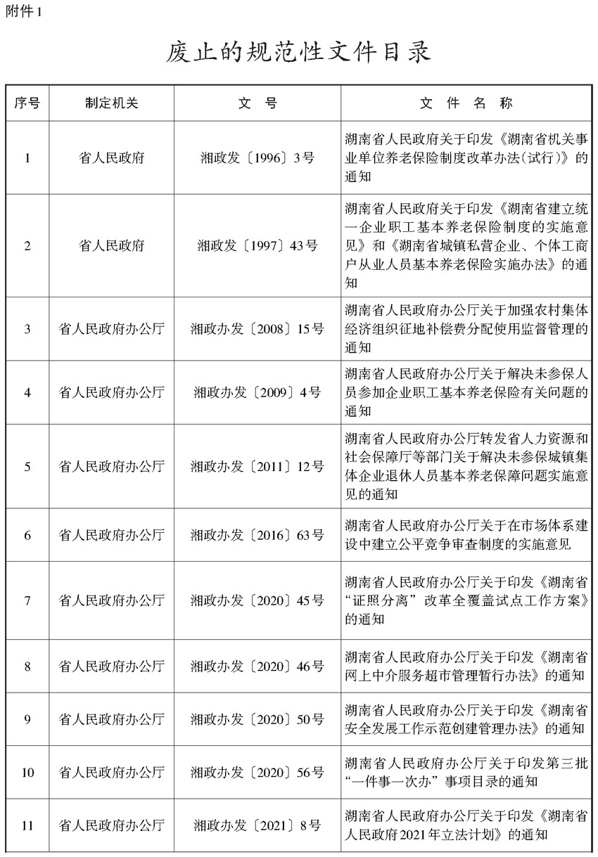 一、廢止《湖南省人民政府關于印發〈湖南省機關事業單位養老保險制度改革辦法(試行)〉的通知》(湘政發〔1996〕3號)等23件規范性文件。