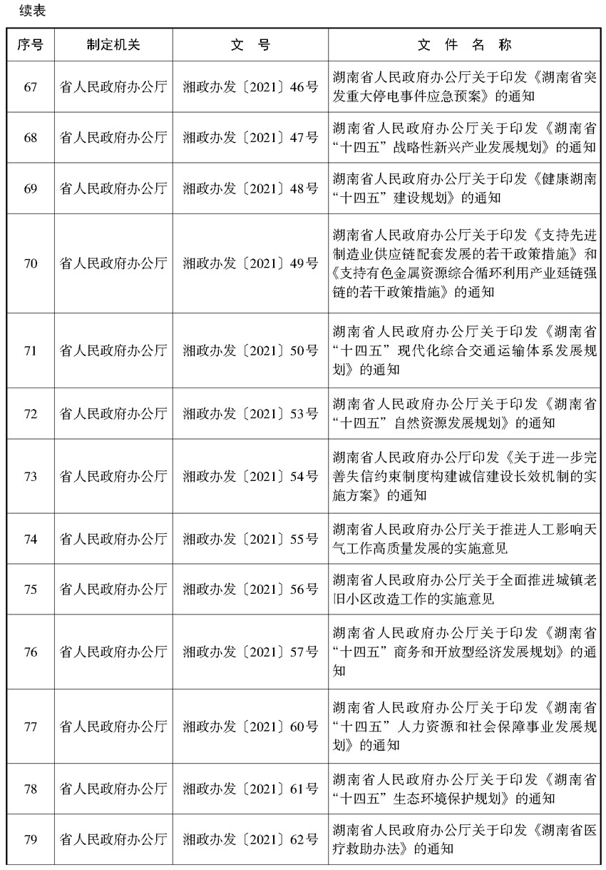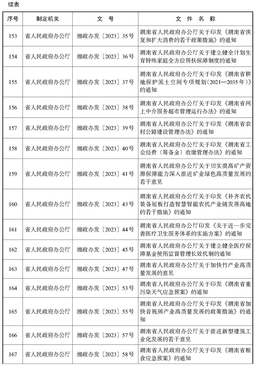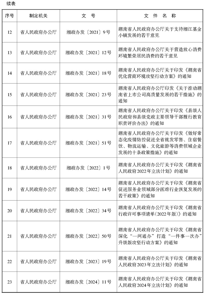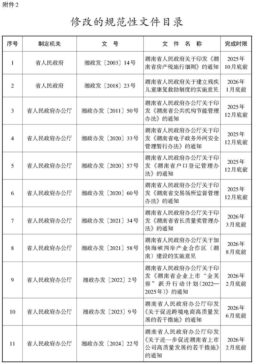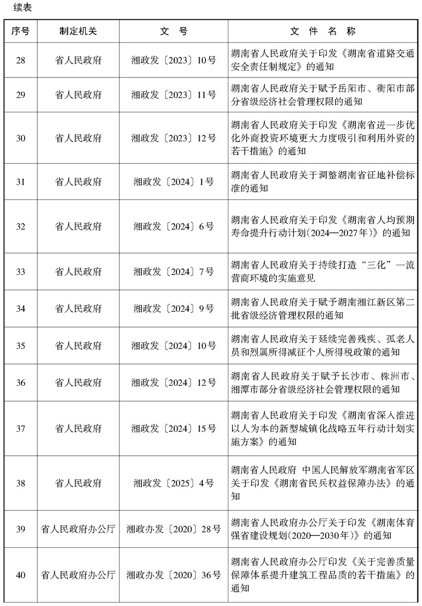 為加快建設法治政府,維護省政府行政規范性文件的權威性和嚴肅性,根據《湖南省行政程序規定》和《湖南省規范性文件管理辦法》等規定,省政府對2025年2月28日前以省政府和省政府辦公廳名義制發的現行有效的規范性文件進行了全面清理。現決定將清理結果公布如下: