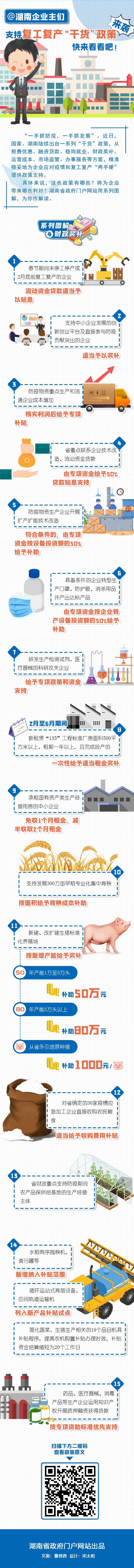 “一手抓防疫,一手抓發(fā)展”。近日,國家、湖南陸續(xù)出臺一系列“干貨”政策,從稅費優(yōu)惠、融資貸款、穩(wěn)崗就業(yè)、財政獎補、運營成本、市場監(jiān)管、辦事服務等方面,精準穩(wěn)妥地為企業(yè)應對疫情和復工復產“兩手硬”提供政策支持。