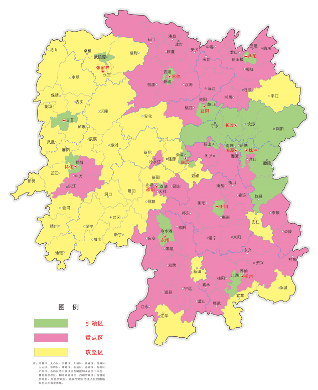 引領區:主要指城鎮化率在80%以上或農村居民人均可支配收入在25000元左右的縣市區,市州內如沒有達到此標準的縣市區則各列入一個城鎮化率最高的區市,共31個。