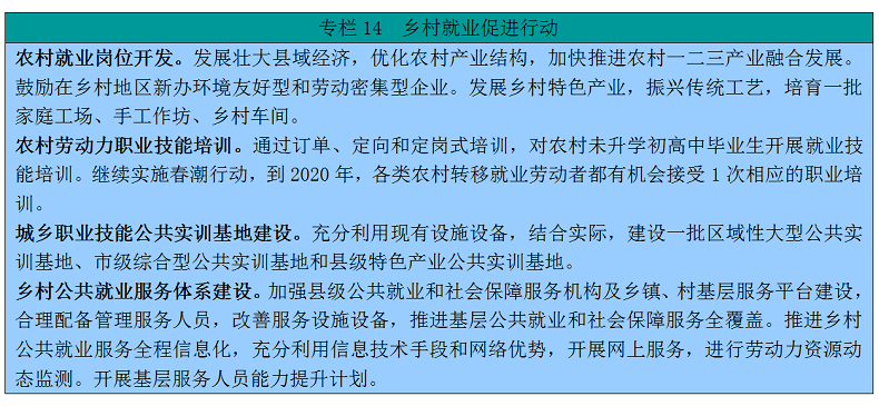 149.提升就業公共服務水平。落實就業政策法規咨詢、信息發布、職業指導、職業介紹等公共就業服務制度。大力開展“311”就業服務行動,每年至少為有就業意愿且未就業的農村勞動力推薦3次崗位、提供1次職業指導、提供1次技能培訓服務。加快公共就業服務信息化建設,打造線上線下一體化服務體系。整合企業、職業院校和各類培訓機構資源,合理布局建設一批公共實訓基地。加強就業困難農村勞動力分類幫扶,實施農村殘疾人“陽光增收計劃”。每年新增農村勞動力轉移就業60萬人(含農村大學生就業)。