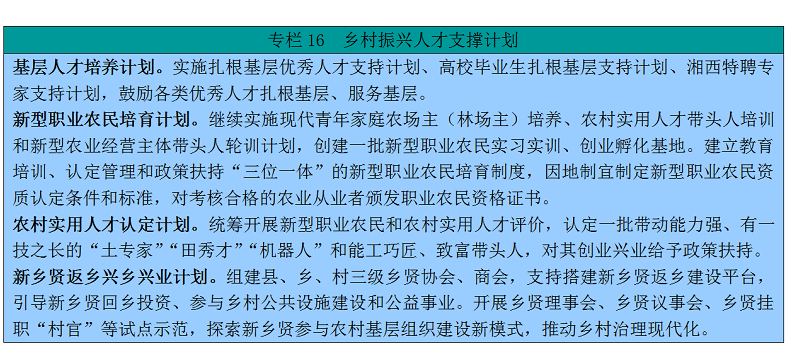 實行更加積極、更加開放、更加有效的人才政策,落實芙蓉人才行動計劃,鼓勵和引導各類人才投身鄉村建設,推動鄉村人才振興,充分發揮好人才在鄉村振興中的支撐作用。