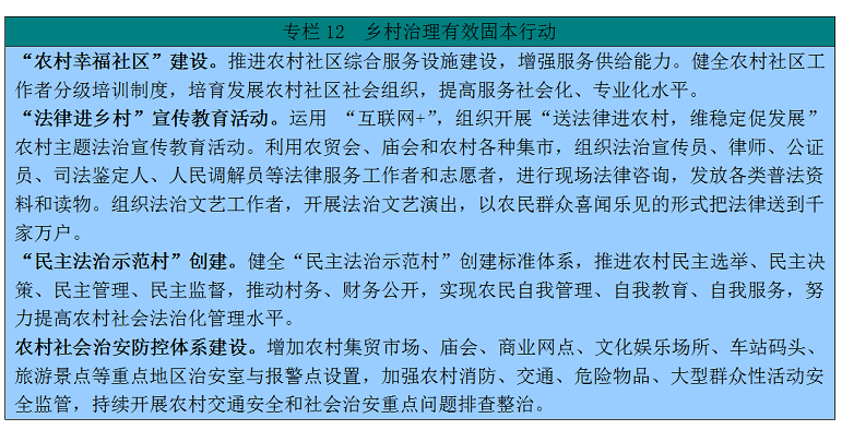 194.強化法治保障。各級黨委和政府要善于運用法治思維和法治方式推進鄉村振興工作,嚴格執行現行涉農法律法規,在規劃編制、項目安排、資金使用、監督管理等方面,提高規范化、制度化、法治化水平。完善鄉村振興法規制度,充分發揮立法在鄉村振興中的保障和推動作用,推動各類組織和個人依法依規實施和參與鄉村振興。