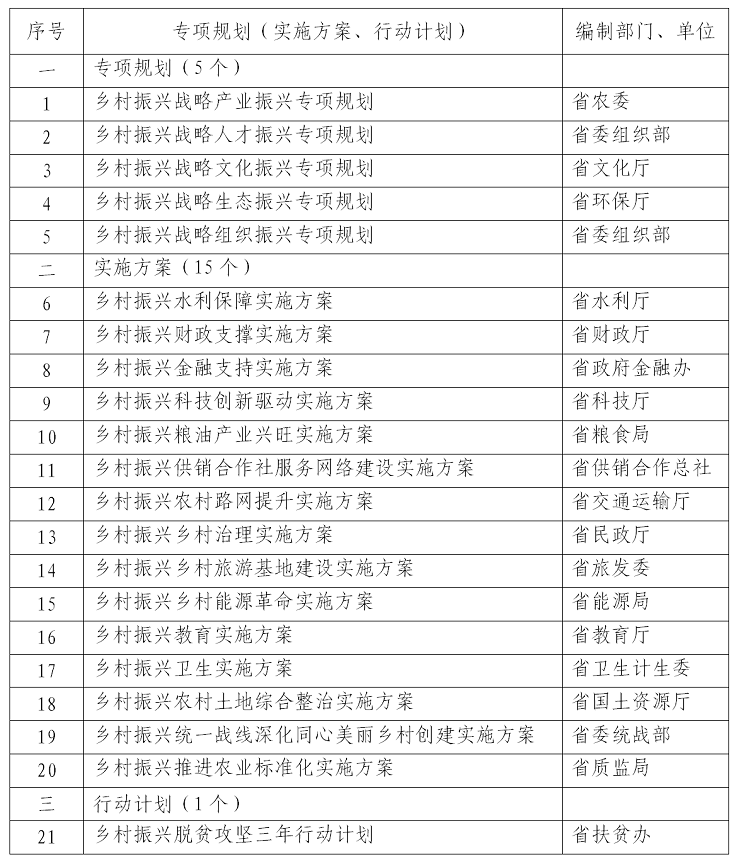 195.堅持規劃引領。以本規劃為統領,因地制宜,統籌考慮產業發展、人口布局、公共服務、文化傳承、土地利用、生態保護,科學編制市州、縣市區鄉村振興規劃(實施方案),明確鄉村振興的具體思路、目標和任務,細化實化政策措施,部署重大工程、重大計劃、重大行動,分步實施,增強可操作性。各部門各司其職、密切配合,抓緊制定專項規劃(實施方案、行動計劃)。