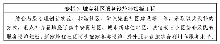 3.健全服務設施網絡。鞏固拓展基層公共服務“一門式”全覆蓋成果,對已有村(社區)綜合服務設施但面積狹小、功能不全、明顯滿足不了服務需求的,采取整合閑置資源、原址改擴建或新建等辦法進行優化升級。結合城市有機更新和縣城城鎮化建設,統籌推進社區綜合服務設施標準化、規范化建設,確保新建社區商業和綜合服務設施面積達標、功能完善。加大盤活存量資產政策支持力度,鼓勵通過換購、劃撥、租借等方式,將機關企事業單位閑置公房、村(社區)綜合服務設施閑置空間和非必要辦公空間、住宅樓底層商業用房等符合條件的存量房屋資源增設為服務設施,支持國有企業以及資產管理公司通過資產收購處置、實質性重組、市場化債轉股等方式盤活社區閑置資產,推動社區閑置低效資產改造轉型,開發用于養老托育等社區服務新功能。鼓勵商務樓宇、商圈市場和較大企業因地制宜開展城市社區綜合服務體建設。加強較大自然村和居民小區服務設施建設,補齊既有居住社區設施建設短板,增加基本公共服務供給,推動綠色發展理念融入社區建設和居民生活。加快易地搬遷集中安置社區綜合服務及配套服務設施建設,中央和省級財政銜接推進鄉村振興補助資金對集中安置區社區綜合服務設施建設予以適當補助。