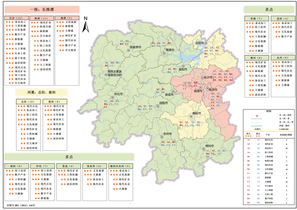 兩翼支撐:發揮岳陽通江達海優勢,重點發展現代石化、食品加工產業;發揮衡陽老工業基地和交通樞紐優勢,重點發展綠色礦業、電工裝備、鹽化工產業,提升省域副中心城市產業支撐力和貢獻度。