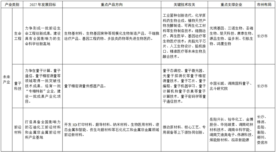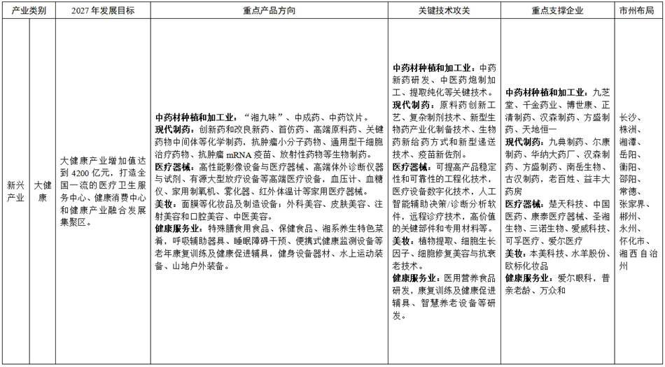 2.現代醫藥。加快邵陽寶東原料藥、華納大醫藥中間體等項目建設,推動創新藥和改良新藥、首仿藥、高端原料藥、關鍵藥物中間體等研發和產業化。支持湘江新區、長沙經開區發展中藥、醫療器械、化學藥、生物藥、醫藥物流等全產業鏈,打造國際生物醫藥智造高地和企業總部基地。加快瀏陽國家級生物醫藥產業基地、國家創新藥物孵化基地建設,支持常德經開區建設原料藥生產基地。爭取長沙航空口岸增設首次進口藥品口岸,爭取跨境電商零售進出口藥品試點。