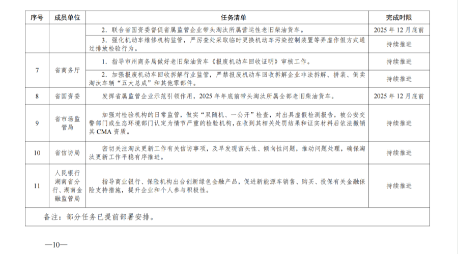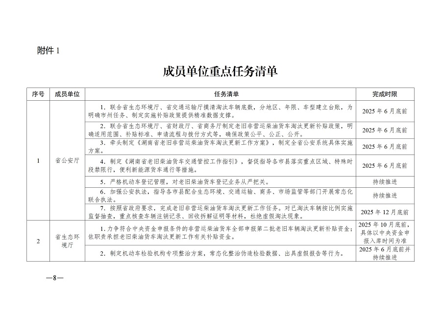 (一)強化組織領導,壓實責任鏈條。按照“省級統籌、部門協同、市縣落實”原則,在省生態環境保護委員會統一領導下,建立由省公安廳牽頭,省生態環境廳、省交通運輸廳、省財政廳、省發展改革委、省工業和信息化廳、省商務廳、省國資委、省市場監管局、省信訪局、人民銀行湖南省分行、湖南金融監管局參與的老舊非營運柴油貨車淘汰更新工作調度協調機制,研究解決工作中的重大問題,統籌推進全省淘汰更新工作。省直各責任部門按照任務分工制定本領域配套實施細則,明確具體措施與完成時限。市州人民政府作為責任主體,建立相應工作機制,督促各縣市、部門細化任務清單,確保責任到崗、落實到人。