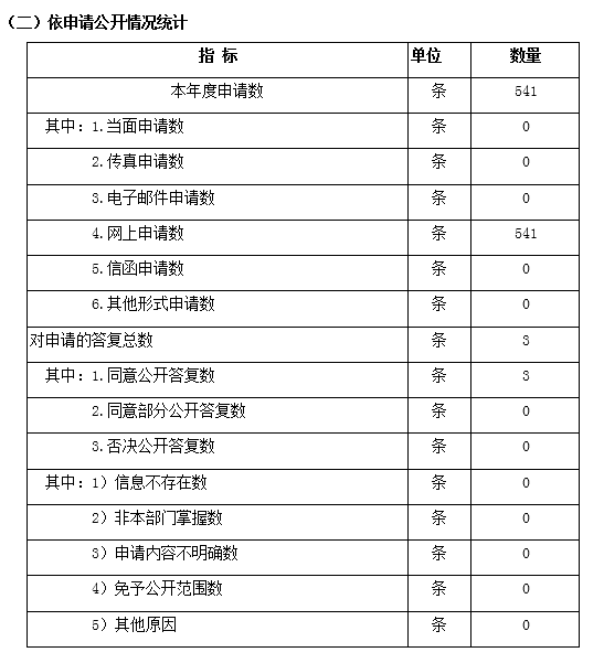2015年,湖南省統(tǒng)計(jì)局收到依申請(qǐng)公開網(wǎng)上申請(qǐng)數(shù)541件,同意公開答復(fù)541件,因涉及個(gè)人隱私不同意公開答復(fù)0件。