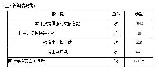2015年,通過“業(yè)務(wù)答疑”、“數(shù)據(jù)咨詢”、“意見建議”、“其他事項(xiàng)”等互動(dòng)版塊,共解答網(wǎng)上用戶咨詢538人次,接聽咨詢電話370余人次,現(xiàn)場(chǎng)接待人數(shù)46人次。內(nèi)容涉及經(jīng)濟(jì)普查、統(tǒng)計(jì)數(shù)據(jù)、統(tǒng)計(jì)知識(shí)、統(tǒng)計(jì)工作、統(tǒng)計(jì)業(yè)務(wù)、統(tǒng)計(jì)職稱考試等各個(gè)方面的內(nèi)容。