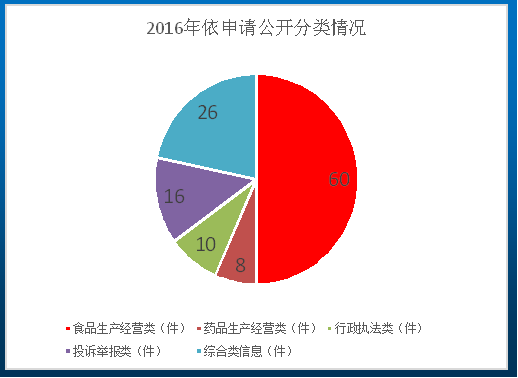 (三)拓展公開內(nèi)容。堅持“以公開為常態(tài),不公開為例外”原則,推動政府信息公開工作上臺階、創(chuàng)特色。結(jié)合食品藥品年度工作重點,制訂了年度目標管理制度,印發(fā)了《2016年政府信息公開工作實施方案》,細化分解了8大重點領(lǐng)域政務(wù)公開目標任務(wù),確保政府信息公開工作部署到位、措施到位、落實到位,同時將政務(wù)服務(wù)納入依法行政的重點工作范疇。堅持以點帶面,全面提升,突出抓好推進行政職權(quán)公開、推進審批許可公開、推進行政處罰公開、推進政務(wù)服務(wù)公開、推進重大政策決策公開、推進日常監(jiān)管信息公開、推進政策解讀信息公開、推進財政資金信息公開等八大重點領(lǐng)域公開工作,確保權(quán)力始終在陽光下運行。2016年省局本級主動公開食藥監(jiān)管信息18825條,是2015年的4.53 倍;辦理依申請公開120件,比2015年增加46件,同比增長62.1%。