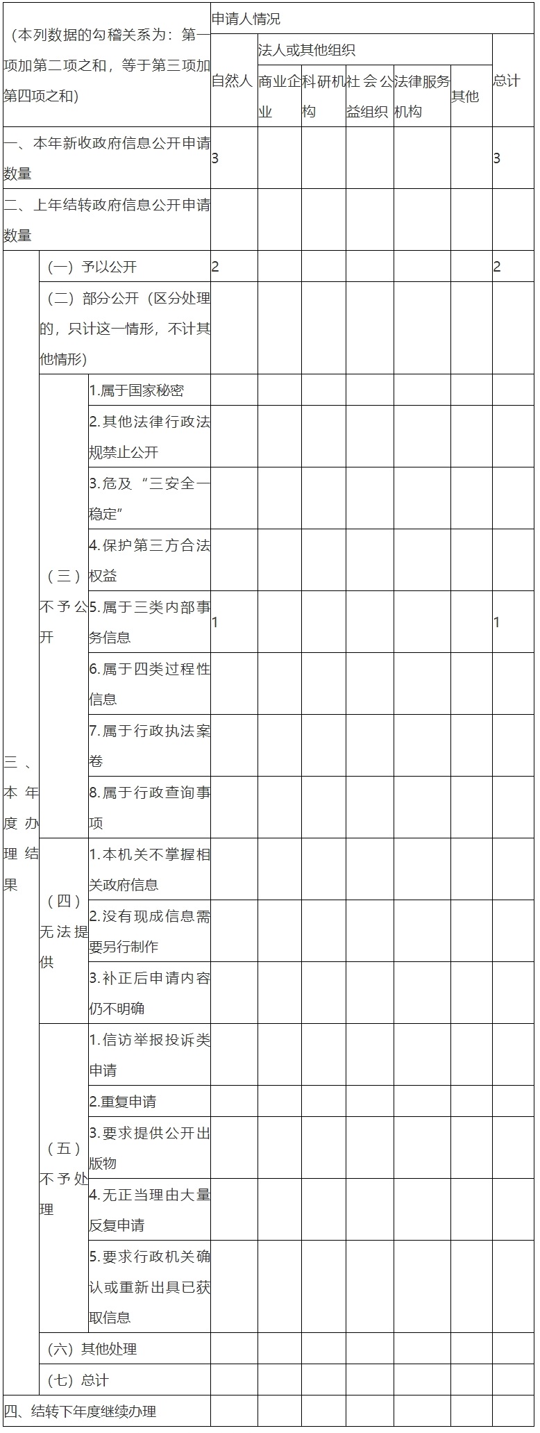 2019年,我廳收到政府信息公開申請3件,全部為自然人申請并全部按期辦結,其中予以公開的2件、屬于內部事務信息不予公開的1件。