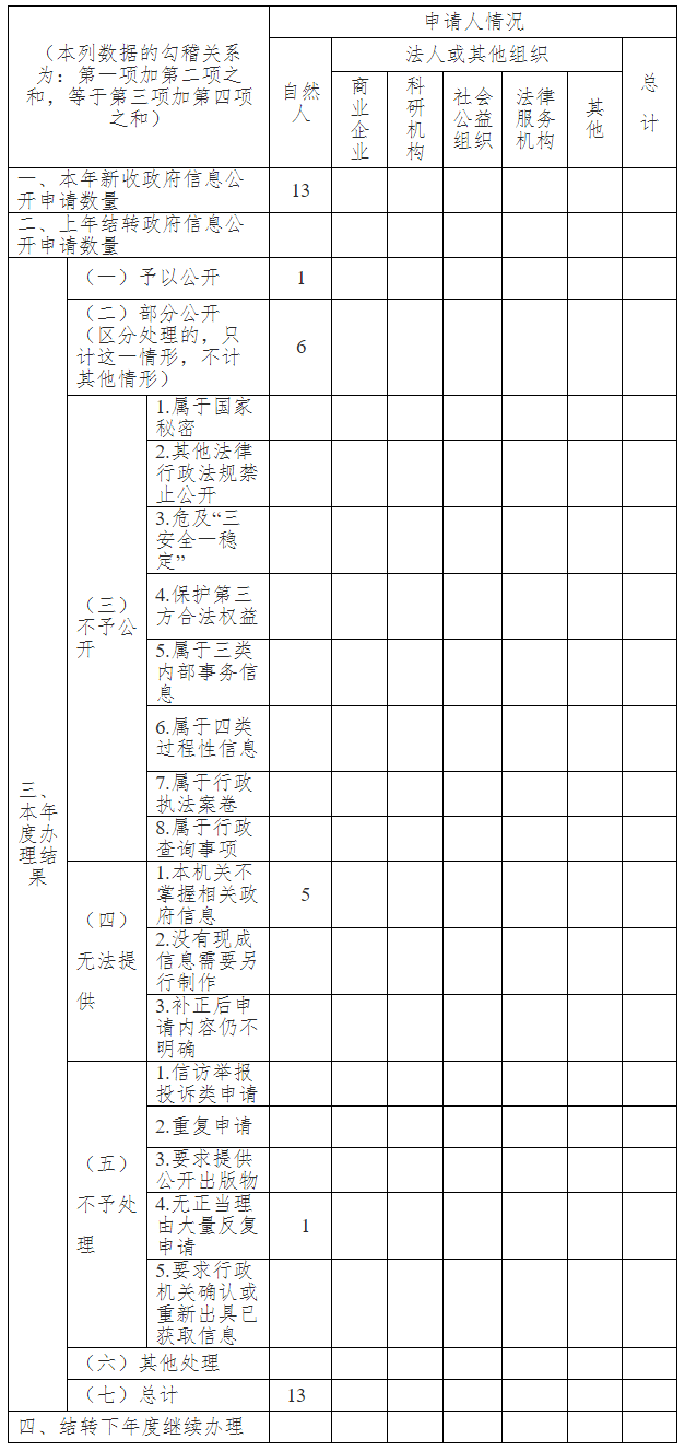 2020年,我局收到13人次自然人政府信息公開申請,都給予了書面答復或電話溝通,引導和建議申請者向相關部門咨詢,依申請公開件按時辦結率100%。