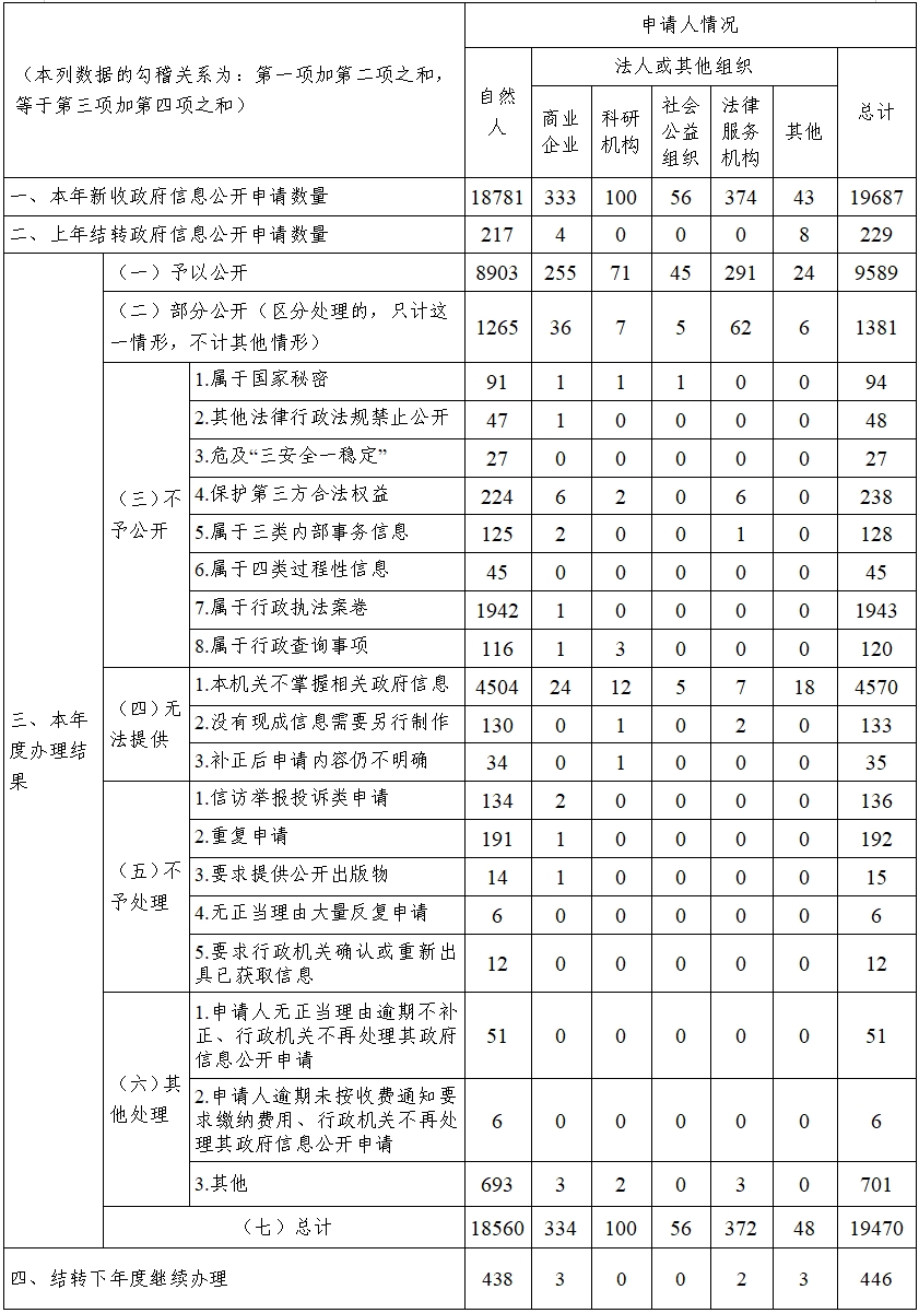 (二)依申請公開情況。全省各級各部門認真貫徹執行政府信息公開條例有關依申請公開規定,依法依規辦理政府信息公開申請件,并堅持便民原則,滿足企業群眾個性化、合理化需求。2023年全省共收到依申請公開件19687件,上年度結轉辦理件229件,共辦理完成19470件,結轉到2024年辦理446件。其中,省政府辦公廳(省數據局)2023年收到政府信息公開申請375件,結轉上年度政府信息公開申請5件,共辦理完成379件,結轉下年度繼續辦理1件;發生行政復議7件,其中4件維持;發生行政訴訟5件,全部維持。
