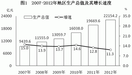 初步核算,全省地區生產總值22154.2億元,比上年增長11.3%。其中,第一產業增加值3004.2億元,增長3%;第二產業增加值10506.4億元,增長12.8%;第三產業增加值8643.6億元,增長12.2%。按常住人口計算,人均地區生產總值33480元,增長10.7%。