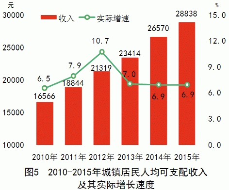 全省全體居民人均可支配收入19317元,比上年增長9.6%,扣除價格因素實際增長8.1%;人均可支配收入中位數16654元。城鎮居民人均可支配收入28838元,比上年增長8.5%,扣除價格因素實際增長6.9%;城鎮居民人均可支配收入中位數27216元。農村居民人均可支配收入10993元,增長9.3%,扣除價格因素實際增長8.1%;農村居民人均可支配收入中位數10032元。分區域看,長株潭地區居民人均可支配收入30655元,增長8.4%;湘南地區18070元,增長9.2%;大湘西地區12877元,增長10.2%;洞庭湖地區17603元,增長9.6%。城鄉居民收入比由上年的2.64:1縮小為2.62:1。