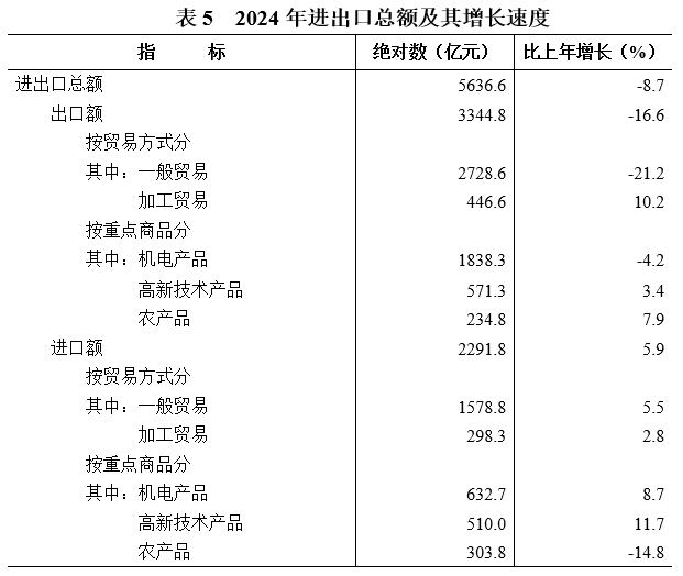 全年進出口總額[21]5636.6億元,比上年下降8.7%。其中,出口3344.8億元,下降16.6%;進口2291.8億元,增長5.9%。分貿易方式看,一般貿易出口2728.6億元,下降21.2%;加工貿易出口446.6億元,增長10.2%。重點出口商品中,機電產品1838.3億元,下降4.2%;高新技術產品571.3億元,增長3.4%。分產銷國別(地區)看,出口美國314.6億元,下降30.1%;出口中國香港463.0億元,下降13.7%;出口歐盟[22]326.1億元,下降8.3%;出口東盟599.4億元,下降21.3%;出口共建“一帶一路”[23]國家1879.4億元,下降16.0%。