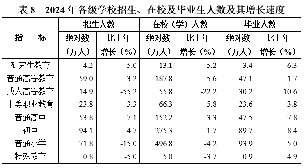 年末有普通高校128所。研究生教育畢業生3.4萬人,普通高等教育畢業生47.1萬人,中等職業教育[25]畢業生23.6萬人,普通高中畢業生47.5萬人,初中畢業生89.7萬人,普通小學畢業生93.9萬人。在園幼兒158.1萬人,比上年下降13.9%。小學適齡兒童入學率[26]100%。各類民辦學校8948所,在校學生202.4萬人。發放高校國家獎學金、助學金(本??粕?6.9億元,資助高校學生(本專科生)81.5萬人次。發放中職國家助學金4.8億元,資助中職學生48.2萬人次。落實義務教育保障資金115.5億元,發放普通高中國家助學金5.3億元。
