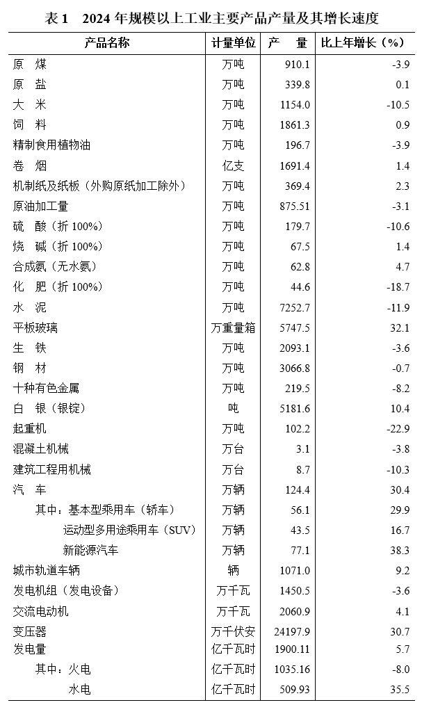 全年規模以上工業統計的主要產品產量中,大米1154.0萬噸,比上年下降10.5%;飼料1861.3萬噸,增長0.9%;原油加工量875.5萬噸,下降3.1%;水泥7252.7萬噸,下降11.9%;鋼材3066.8萬噸,下降0.7%;十種有色金屬219.5萬噸,下降8.2%;混凝土機械3.1萬臺,下降3.8%;汽車124.4萬輛,增長30.4%;發電量1900.1億千瓦時,增長5.7%。