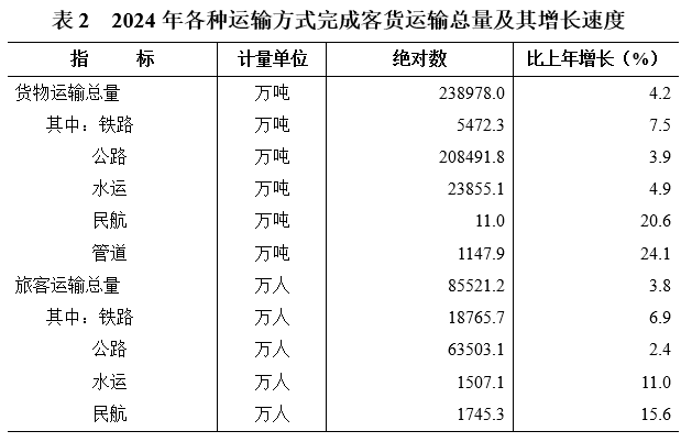 [8]貨物運輸總量及周轉量包括鐵路、公路、水路、民航和管道五種運輸方式完成量,2024年增速按可比口徑計算。
