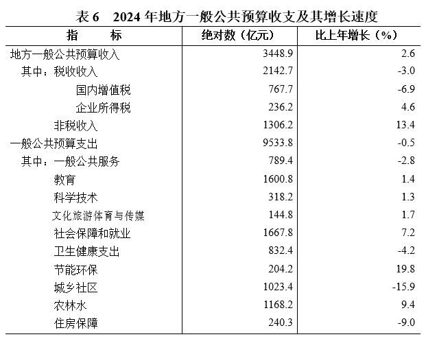 全年地方一般公共預算收入3448.9億元,比上年增長2.6%。其中,稅收收入2142.7億元,下降3.0%;非稅收入1306.2億元,增長13.4%。稅收收入中,國內增值稅767.7億元,下降6.9%;企業所得稅236.2億元,增長4.6%。一般公共預算支出9533.8億元,下降0.5%。其中,教育支出1600.8億元,增長1.4%;社會保障和就業支出1667.8億元,增長7.2%;衛生健康支出832.4億元,下降4.2%;科學技術支出318.2億元,增長1.3%;住房保障支出240.3億元,下降9.0%。