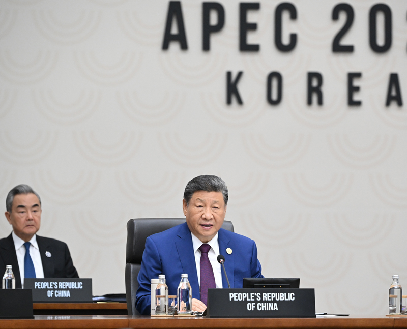 當地時間11月1日上午,國家主席習近平在韓國慶州出席亞太經合組織第三十二次領導人非正式會議第二階段會議,并發表題為《共同開創可持續的美好明天》的重要講話。新華社記者 謝環馳 攝