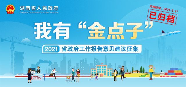 “我有‘金點子’——2021省政府工作報告意見建議征集”活動由湖南省政府門戶網站聯合多家媒體及全省政府網站、政務新媒體發起,旨在全網征集網民對政府工作的意見建議,一起為湖南發展描繪新藍圖。活動將持續到2021年湖南省兩會前夕。