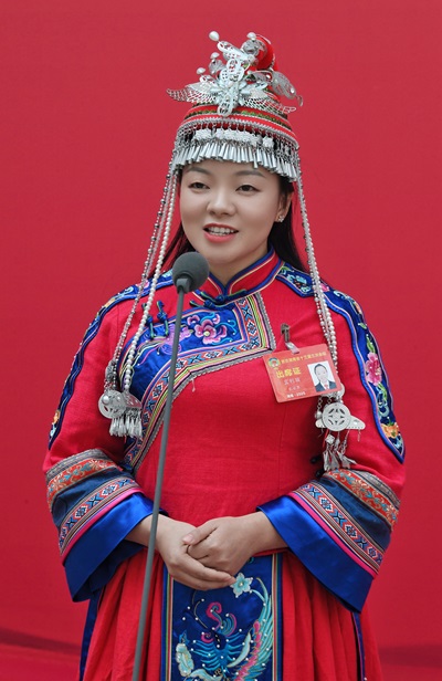 “我是來自郴州桂東的畬族青年,我身上穿的就是畬族傳統服飾鳳凰裝。”在“委員通道”上,省政協委員、郴州桂東縣藍老爹茶業開發有限公司總經理藍利麗驕傲地展示。