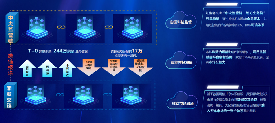 一是以“湘股交鏈+科技監管”助力證監會穿透式監管。針對托管、掛牌、股權質押等業務場景收集的13億+企業數據,湖南股交所統一數據標準,強化數據治理,借助跨鏈技術推動“湘股交鏈”與證監會“監管鏈”聯通對接,完成數據T+0自主跨鏈報送,提升科技監管效能,讓監管部門看得清、看得明本市場業務情況,實現全過程穿透式監管。目前,湖南股交所已完成了涉及企業主體、交易、融資等15大類、1800余個字段、超244萬余條業務數據的跨鏈報送,并獲取了“監管鏈”分配的本市場近17萬投資者的全國統一編碼,為將區域性股權市場投資者證券賬戶納入資本市場統一證券賬戶體系奠定了基礎。