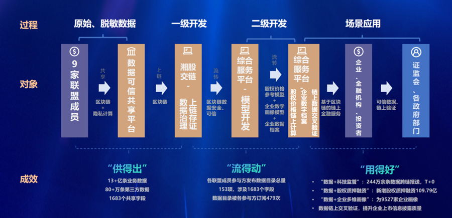 二是以“湘股交鏈+數據可信共享”建立企業多維數字檔案。基于區塊鏈分布式身份認證、隱私計算等技術,湖南股交所自主研發數據可信共享平臺,在保證原始數據不出域的情況下,為數據聯盟方提供數據目錄、數據訂閱和數據共享等統一的數據服務。數據流通過程通過區塊鏈記錄,只可溯源、不可篡改,打消了數據聯盟方共享數據的顧慮,有效解決了傳統集中式數據庫“不愿、不敢、不會”共享數據的難題。目前,湖南股交所拓展了省地方金融管理局、省中小企業服務中心、湖南征信等9個聯盟單位,各數據聯盟方發布數據目錄總量153項、涉及1683個字段,數據共享總量410萬條,有效拓展了企業多維數據,逐步形成了企業多維數字檔案。