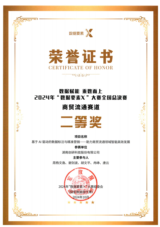 湖南創研科技股份有限公司《基于歸因算法的數據標注與精準營銷 助力商貿流通領域智能發展》獲“數據要素x”商貿流通賽道二等獎。