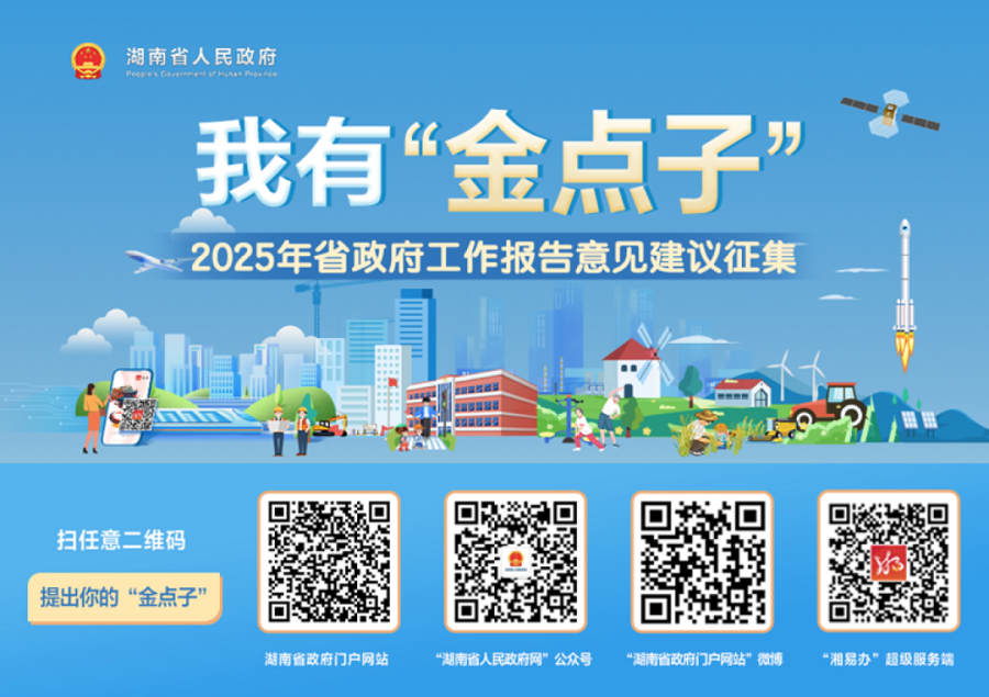 在2025年湖南省“兩會”即將召開之際,為更好聽民意知民愿聚眾智,做好2025年省政府工作報告起草工作,即日起至2025年湖南省兩會召開前,湖南省政府門戶網站聯合多家媒體與各市州、省直部門政府網站和政務新媒體以及“湘易辦”超級服務端,開展“我有‘金點子’——2025年湖南省政府工作報告意見建議征集”活動。