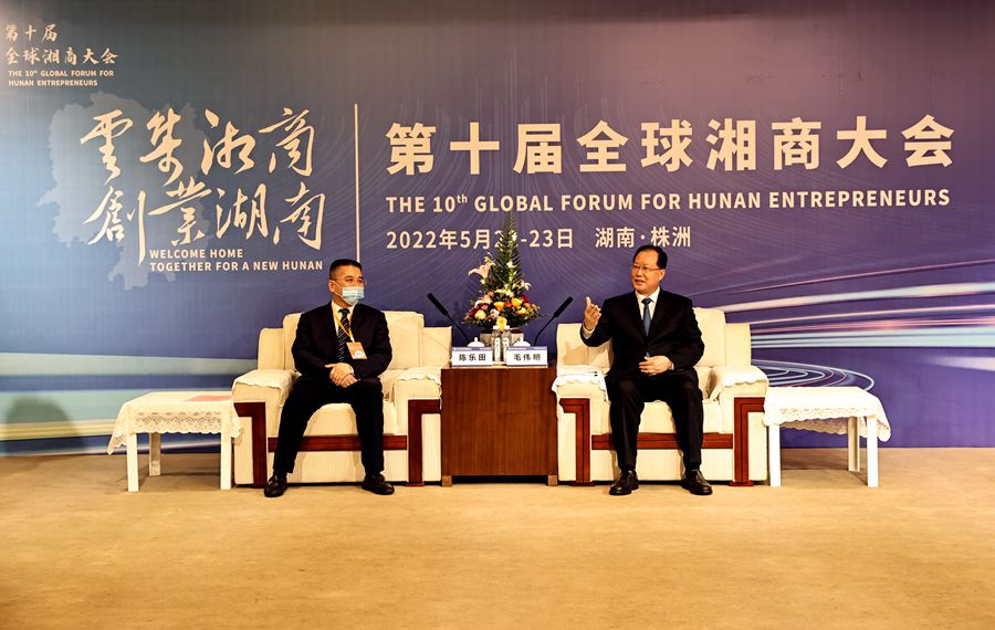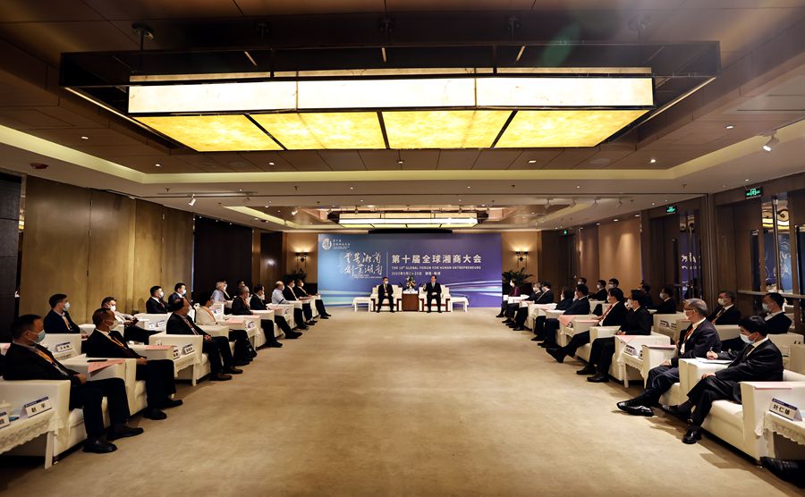 5月22日下午,省委副書記、省長毛偉明與出席第十屆全球湘商大會的部分嘉賓代表座談。