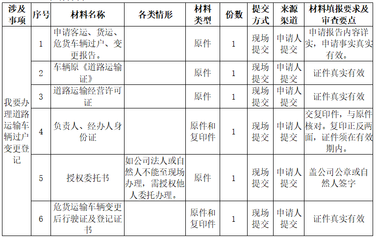 1、道路客運車輛:道路客運企業擬轉籍或過戶已辦理《道路運輸證》的客運車輛。