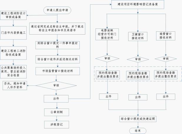 營業執照2個工作日,電影放映經營許可證9個工作日,公共場所衛生許可證7個工作日,戶外廣告許可證5個工作日,臨時占用街道兩側和公共場地許可證5個工作日,建設工程消防設計審核或備案7個工作日,公眾聚集場所投入使用、營業前消防安全檢查合格證8個工作日,稅務事項辦理可即時辦結。不符合相關情形,或涉及增值稅專用發票(增值稅稅控系統)最高開票限額審批且最高開票限額十萬元以上的最多需要20個工作日。