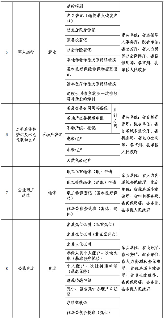 一、梳理明確“一件事”。將《指導意見》“一件事一次辦”事項基礎清單與《行動方案》所部署的26個主題式、套餐式場景應用(以下稱主題)結合起來落實并做適當調整,明確牽頭單位和配合單位。如將《指導意見》事項基礎清單中的“企業開辦”“企業準營”事項納入《行動方案》中的“企業開辦”主題,將“企業簡易注銷”事項納入“企業注銷”主題(詳見附件)。將《行動方案》要求在2023年底前完成的“員工保障”“就業”“婚姻”“身后”等4個主題提前至2022年底前完成。鼓勵各地結合實際拓展本地區“一件事一次辦”事項范圍。