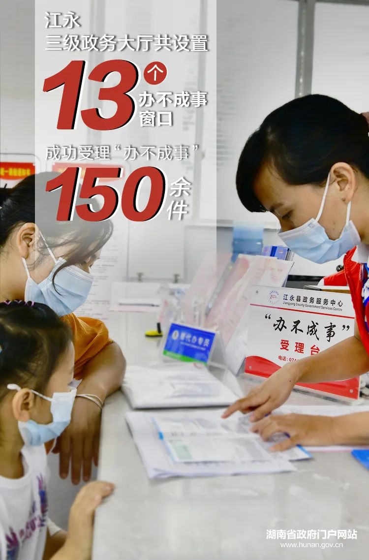目前,江永縣三級政務大廳共設置13個“辦不成事”窗口,成功受理“辦不成事”150余件。同時為了“零距離”服務企業和群眾,江永縣建立起一支“紅馬甲”幫代辦隊伍,配好村級“代辦員”、鄉鎮“特派員”、分管“協調員”,去年為4萬余人次提供幫辦代辦服務。