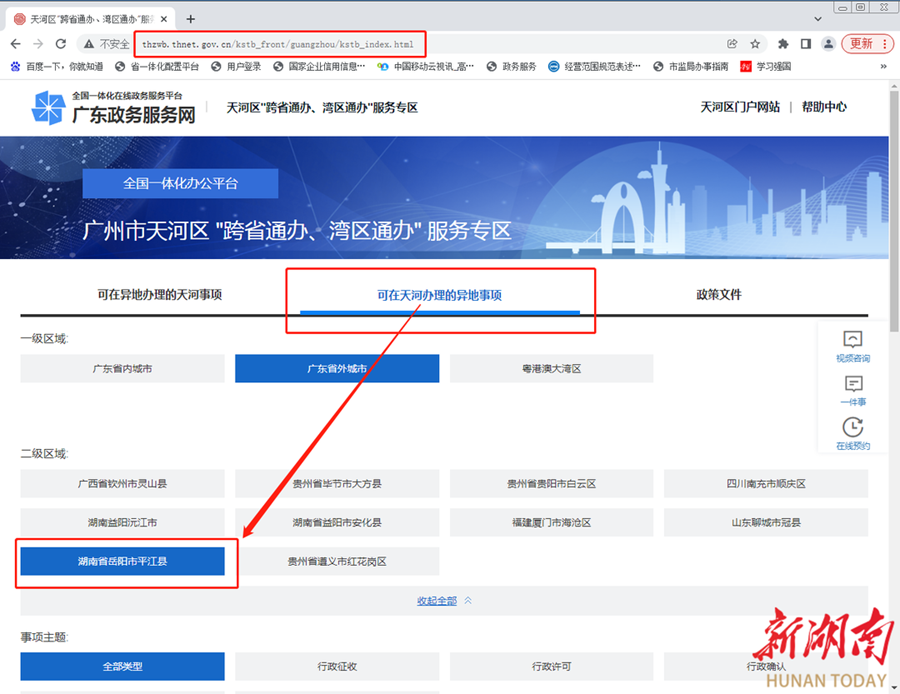 據了解,廣州市天河區已在“跨省通辦、灣區通辦”服務專區網站設立平江縣跨省通辦專欄,上線了43個可網辦事項,平江縣在天河區工作的鄉友可登錄天河區政務服務網站,在“天河辦理的異地事項專區”、廣東省外城市中找到平江縣事項辦理區,異地申辦原來要本人回平江才能辦理的事項。如市監局的營業執照、人社部門的查詢認證、教育局教師資格認定等業務。同樣,在平江的群眾也可以在該平臺“可在異地辦理的天河事項”專區申請辦理在天河區需要辦理的有關事項,切實享受到“數據多跑路,群眾少跑腿”的政策福利。