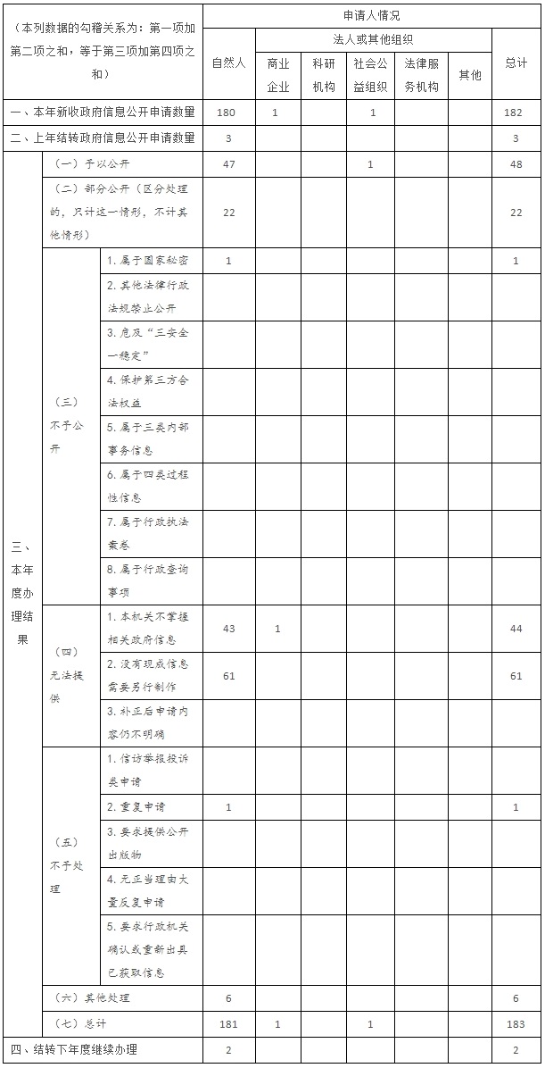 切實保障人民群眾依法獲取政府信息,按照“集中受理、分散辦理、全程跟蹤”的原則,對政府信息公開申請事項進行審核、受理、登記、分發、追蹤、答復、歸檔等規范化流程處理。2019年共收到政府信息公開申請182件,除結轉到下一年辦理的2件外,均按期依規依程序答復,全年未收取信息處理費。發生行政復議8件、行政訴訟5件,已經審結12件、尚未審結1件,沒有發生結果糾正或敗訴情形。